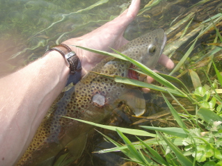 Après une journée de travail, je retrouve le sourire en allant rejoindre la rivière de mon enfance. Il est 14 heures, j'enfile cuissardes, gilet et me voila partit à la recherche de mes chéres copines. Quelques éclosions, très peu d'activité ; j'attaque 3 gobages qui m'apporteront 3 jolies truites sauvages!!! que je cajole et leurs